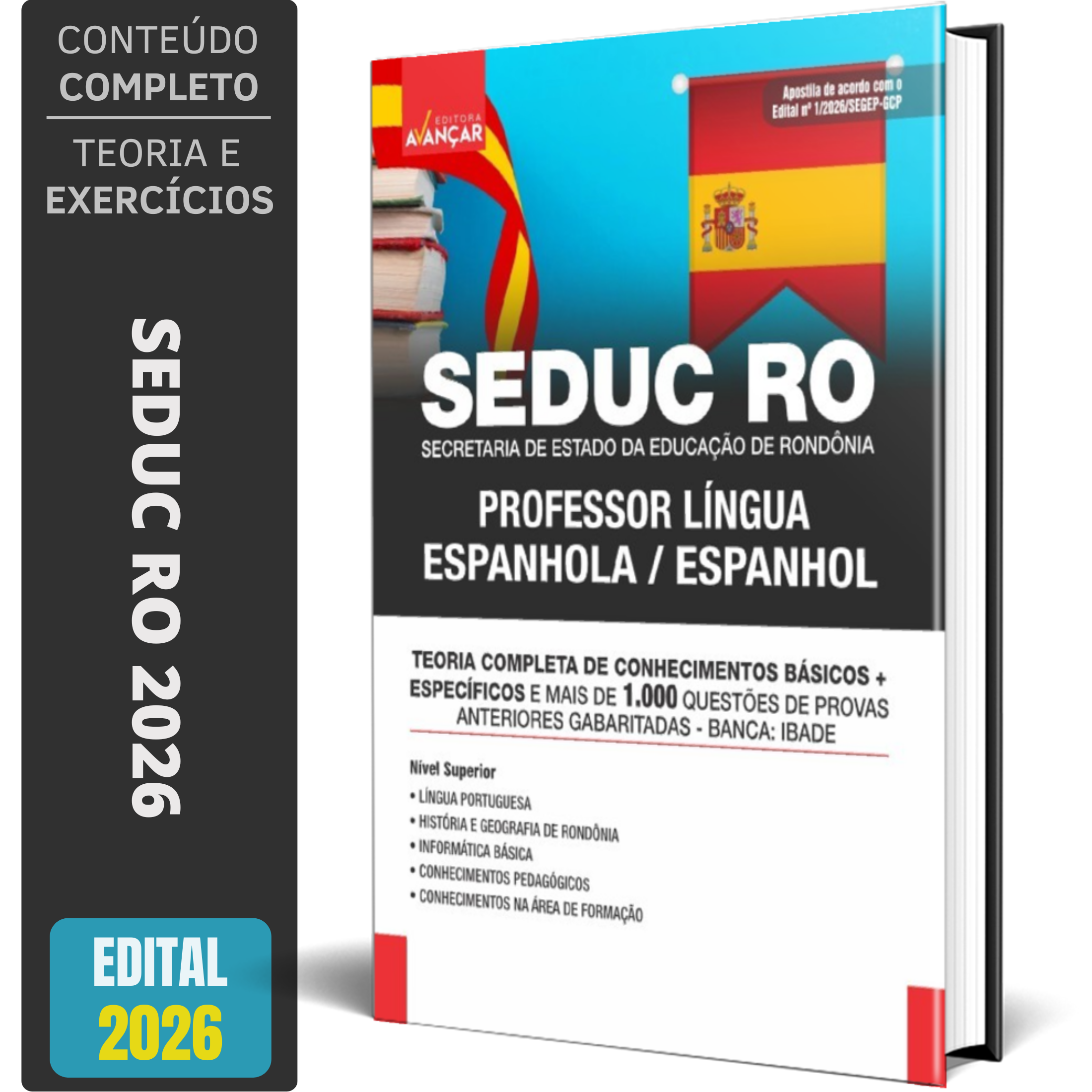 A Apostila Concurso SEDUC RO - SECRETARIA DE ESTADO DA EDUCAÇÃO DE RONDÔNIA 2026 - PROFESSOR: LÍNGUA ESPANHOLA contempla as seguintes matérias:
