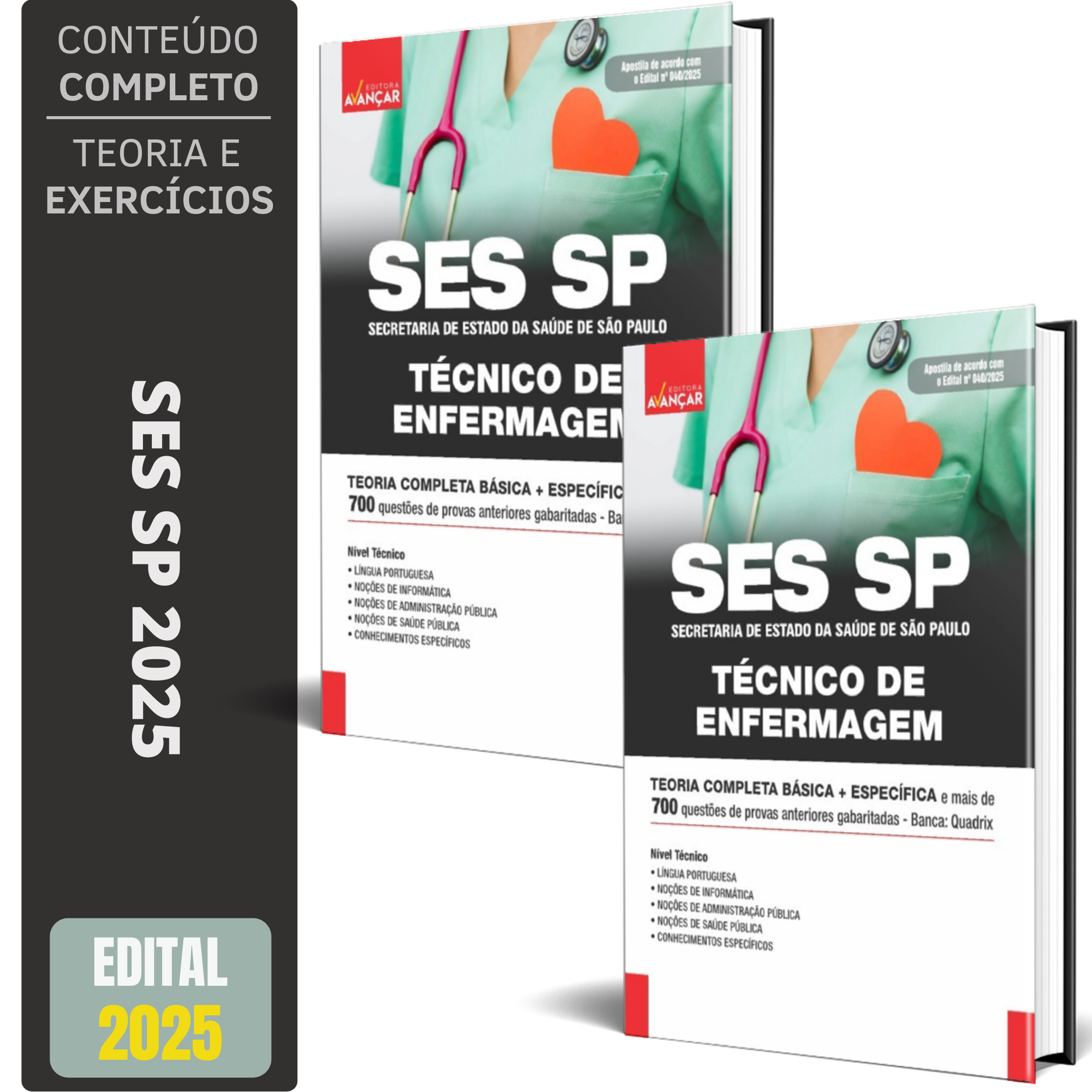 A Apostila Concurso SES SP - SECRETARIA DE ESTADO DA SAÚDE DE SÃO PAULO 2025 - TÉCNICO DE ENFERMAGEM contempla as seguintes matérias: