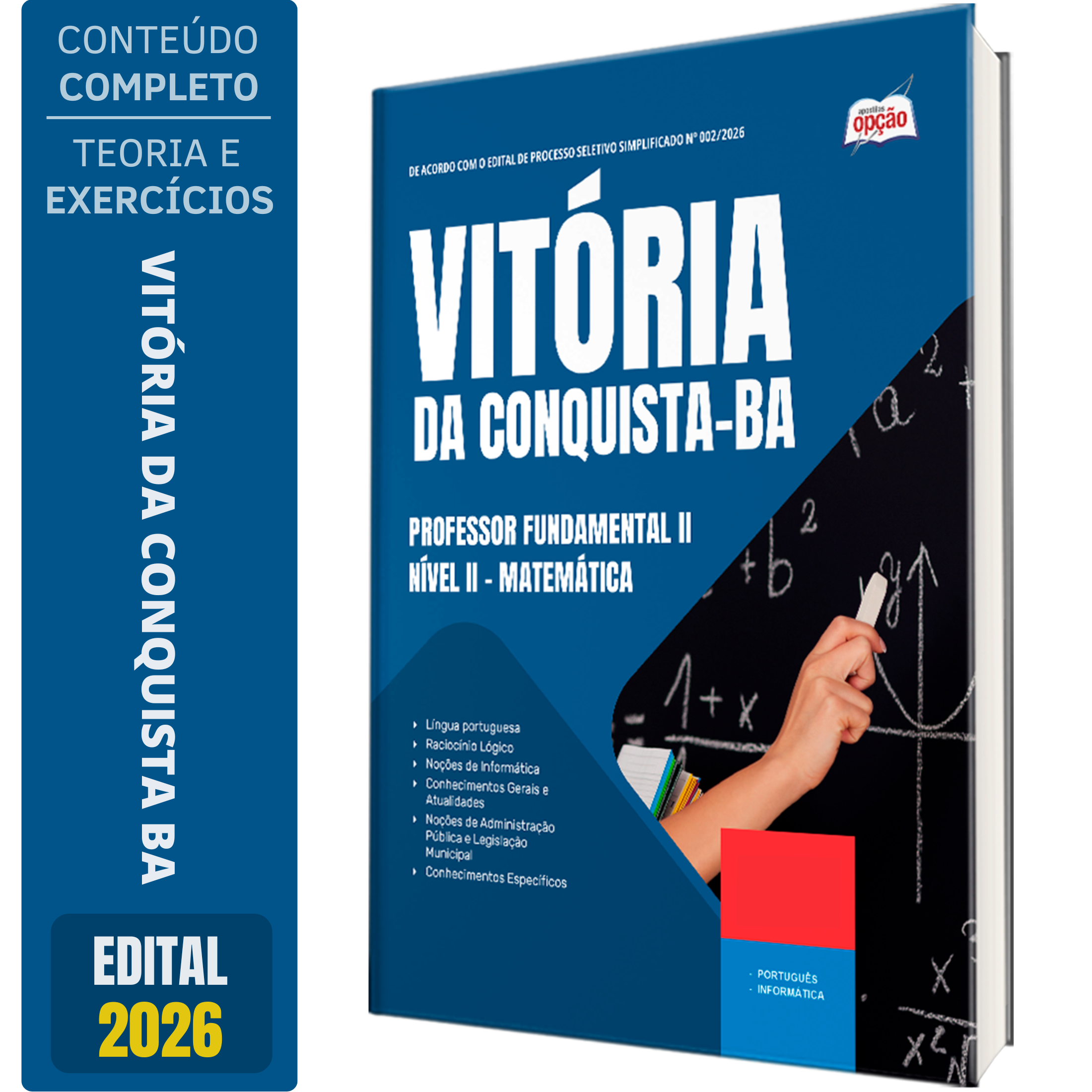 A Apostila para Professor Fundamental II Nível II - Matemática do concurso Prefeitura de Vitória da Conquista BA 2026 foi rigorosamente elaborada conforme o edital, o que torna o seu conteúdo completo e atualizado.