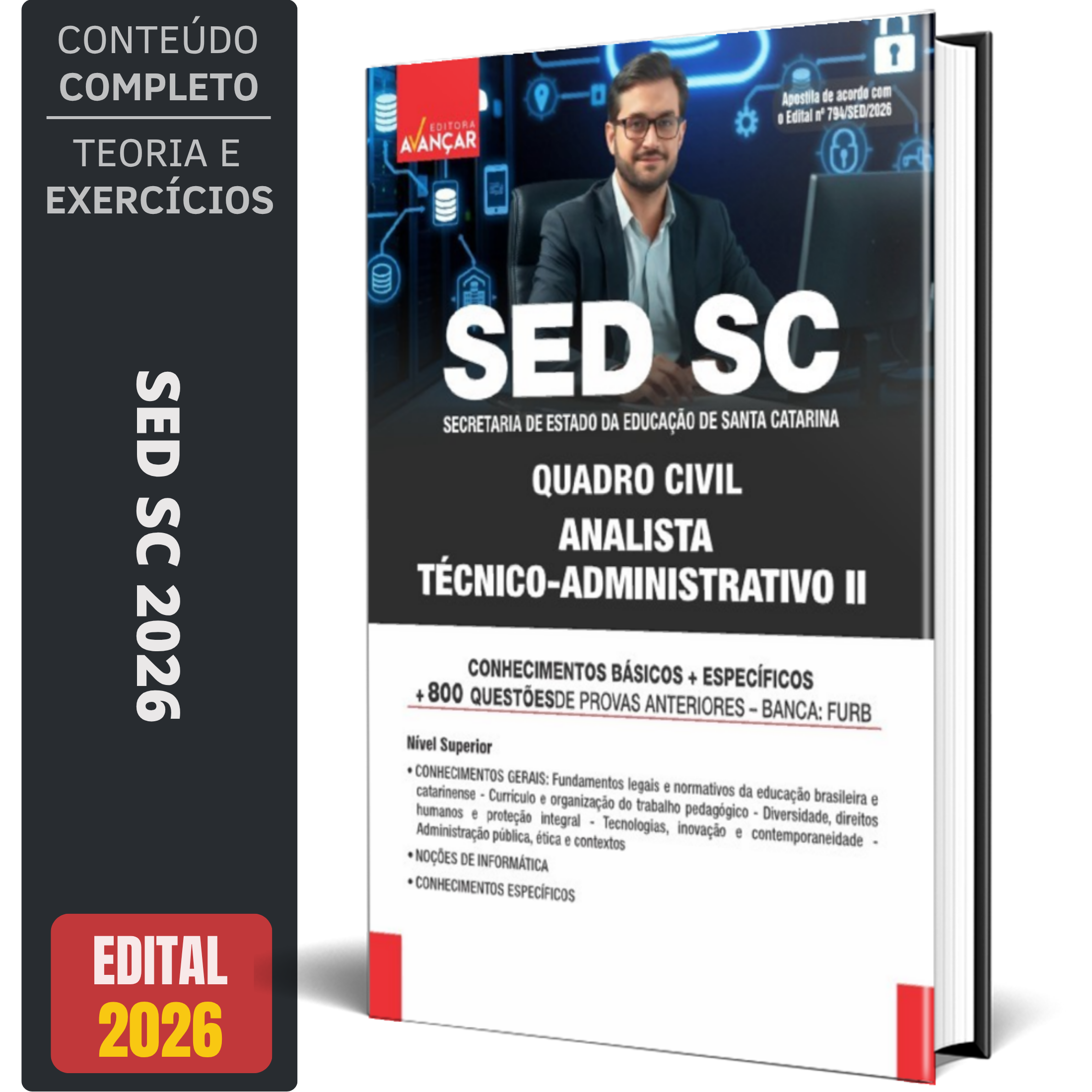 A Apostila para - Quadro Civil - Técnico Administrativo 2 do concurso SED SC 2026 foi rigorosamente elaborada conforme o edital, o que torna o seu conteúdo completo e atualizado.