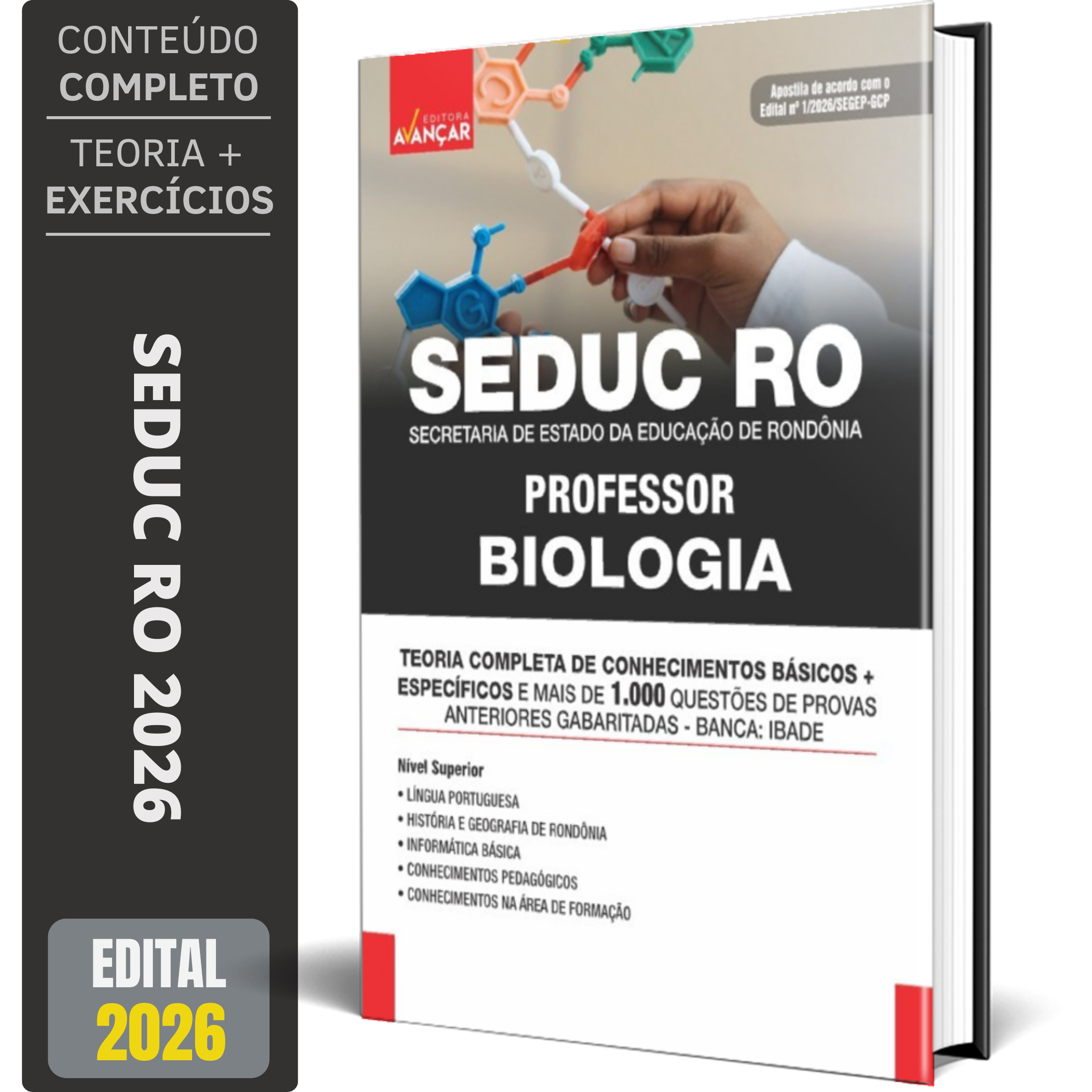 A Apostila Concurso SEDUC RO - SECRETARIA DE ESTADO DA EDUCAÇÃO DE RONDÔNIA 2026 - PROFESSOR: BIOLOGIA contempla as seguintes matérias: