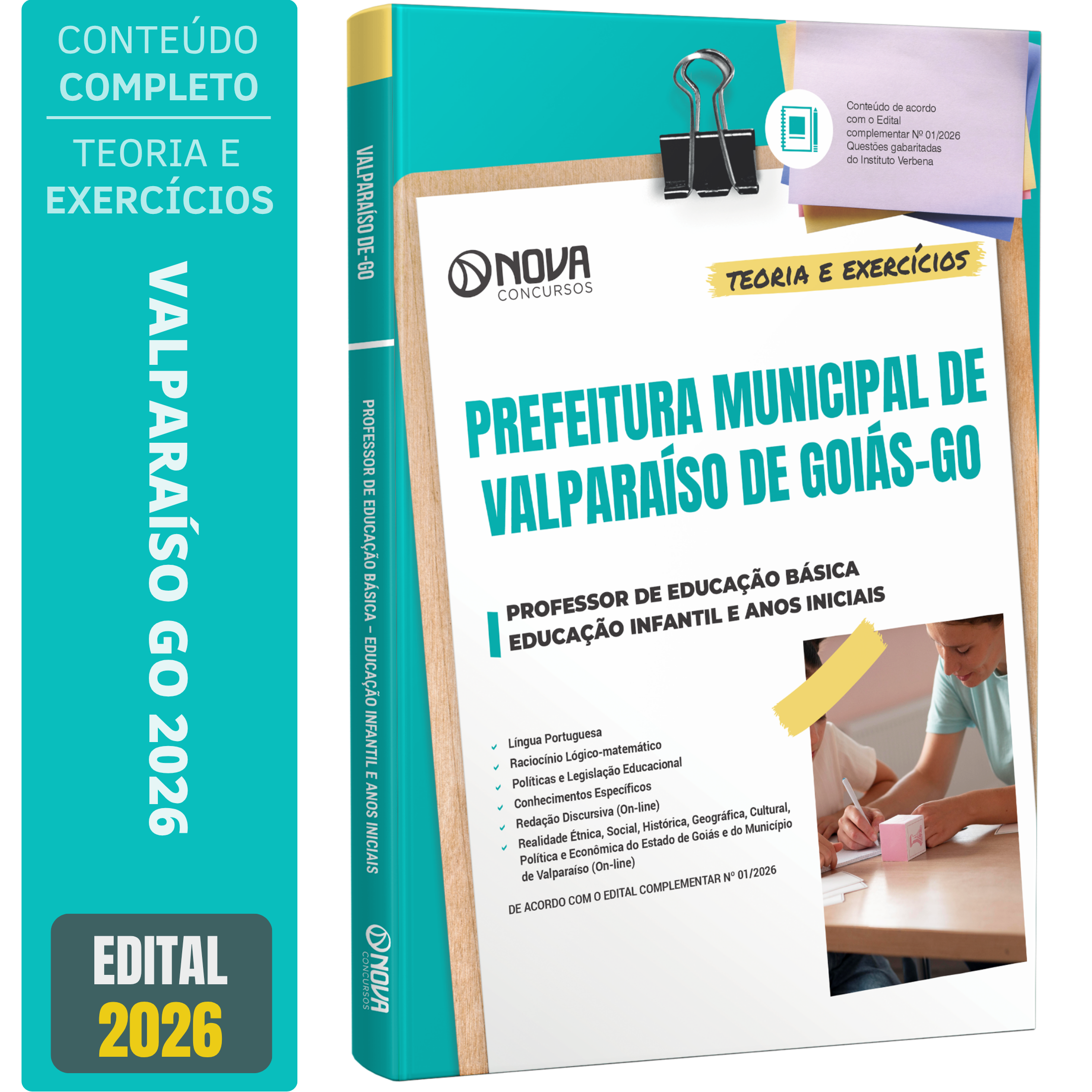 A Apostila para Professor de Educação Básica - Educação Infantil e Anos Iniciais do concurso Prefeitura de Valparaíso de Goiás GO 2026 foi rigorosamente elaborada conforme o edital, o que torna o seu conteúdo completo e atualizado.